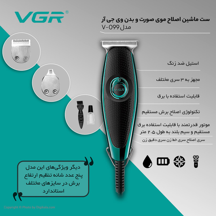مجهز به ۳ سری مختلف جهت اصلاحسری اصلاحسری خط زنسری دقیق زن (جهت اصلاح کناره های ریش و سبیل)موتور قدرتمند با قابلیت استفاده به صورت برق مستقیمسیم بلند به طول ۲.۵ متر۵ عدد شانه تنظیم ارتفاع برش در سایزهای مختلفاستاندارد CE