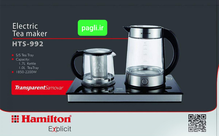چایساز همیلتون مدل HTS-992 محصولی زیبا و کارآمد با توان 2200 وات است، که برای آماده کردن چایی و سایر نوشیدنی ها در کوتاهترین زمان، بسیار مناسب می باشد. چایساز همیلتون مدل 992 دارای دو حالت جوشاندن و گرم نگهدارنده است. که با رسیدن آب به دمای جوش کتری به صورت خودکار خاموش می شود، و پس تهیه نوشیدنی در قوری دستگاه، با فشردن دکمه ی مربوط به حالت گرم نگه دارنده، می توان نوشیدنی را برای مدت طولانی گرم نگه داشت. چای ساز Hamilton HTS-992 با بهره گیری از کتری بدون سیم و قابلیت چرخش 360 درجه، از جنس شیشه با ظرفیت 1.7 لیتر ساخته شده است. و قوری آن نیز از شیشه مقاوم به حرارت با گنجایش 1 لیتر نیز می باشد.